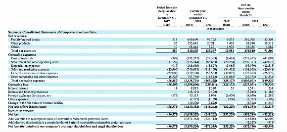 招股书显示,瑞幸在2018年的净收入为8.4亿元人民币,净亏损16.2亿元人民币;2019年截至3月31日净收入为4.8亿元人民币,净亏损5.5亿元人民币。