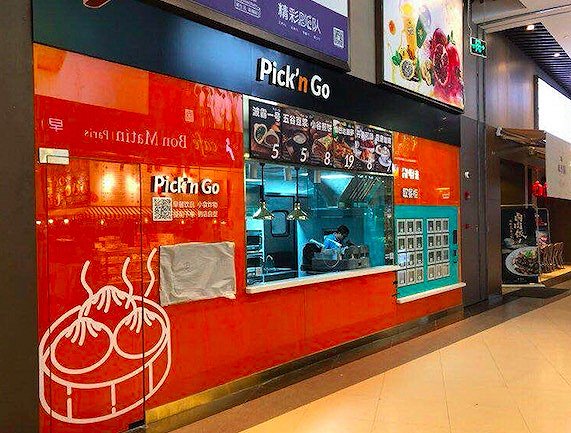 从图片上看,Pick’n go由人工柜台和自提货柜组成,下单和收银主要靠盒马APP完成,操作间则以人工为主。自提柜提供的产品以早餐饮品、小食炸物为主,菜单包括“波霸一号、五谷豆浆、小谷煎饼、风味咖啡”等,无法辨认具体品类数字。