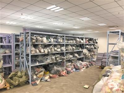 拉夏贝尔天津物流中心大楼三楼行政办公处,堆满大量库存衣物。