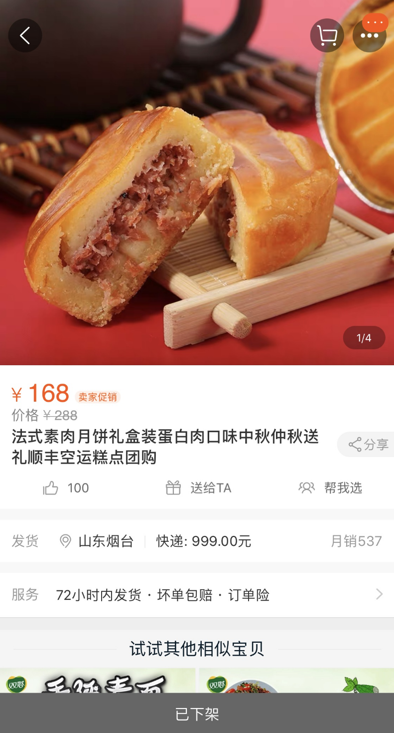 该工作人员还透露,今天上午9时,这款素肉月饼在双塔食品旗舰店开始了线上“秒杀”销售,并很快结束,后续是否还有“秒杀”活动尚不清楚。