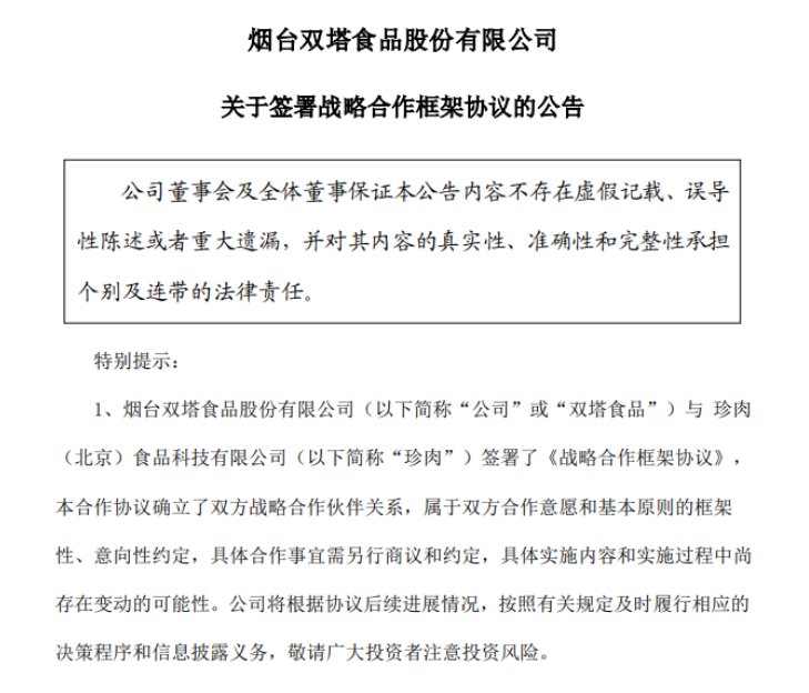 在公告中,双塔食品称,将与北京珍肉开展在植物蛋白肉领域的合作与创新,尝试进行联合市场开拓、推广及产品营销,发挥双方优势,提供专业化服务。双方还将积极探索并拓展更为广泛的合作空间。但双塔食品也表示,本次签订的合作协议在短期内不会给公司带来收益,对公司2019年度的经营业绩亦不构成重大影响。