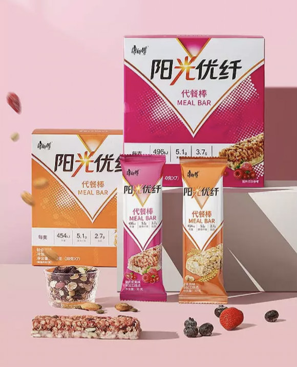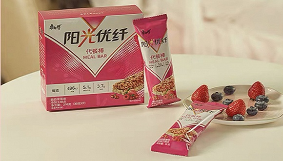 近日,康师傅天猫旗舰店悄然上架了新品牌——“阳光优纤”,目前该品牌旗下只有一款代餐棒产品。这款代餐棒有轻食原味、酸奶浆果味两种口味,一盒7支的定位为63元,于10月9号在天猫旗舰店公开发售。