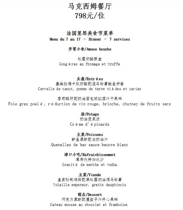 马克西姆餐厅作为法餐的经典代表,将在“马克西姆——里昂美食节”期间推出特色菜单。