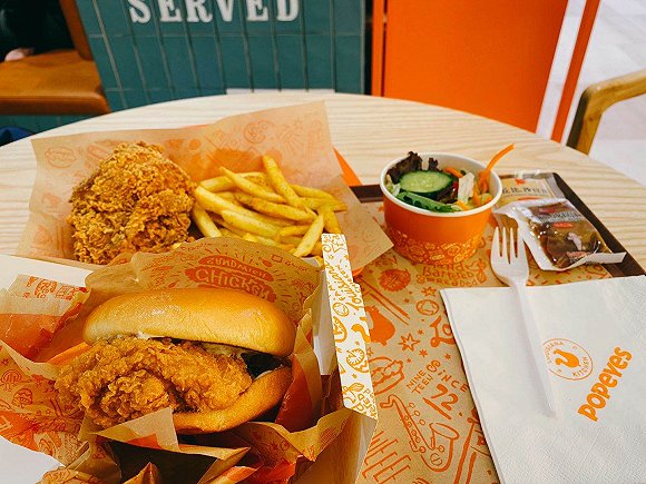 Popeyes的中国内地菜单包括美国市场的代表性产品,比如招牌酪乳风味鸡腿排汉堡、带骨鸡、奶酥手指饼干等等。