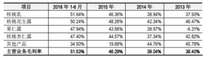 养元饮品表示,公司主要产品核桃乳的毛利率逐期提高,特别于2015年、2016年1-6月,受原材料价格下降的影响,毛利率提高较多;公司核桃花生露、果仁露、核桃杏仁露的毛利率变动趋势与核桃乳毛利率变动趋势相同;其他产品包括杏仁露、核桃奶复合蛋白饮料,产销量较小,毛利率相对不稳定。