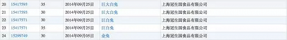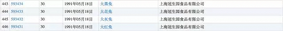 大家小时候吃的正版大白兔奶糖是上海冠生园食品有限公司出品的,而每经小编(微信号:nbdnews)在国家工商管理总局商标局系统中查询到,上海冠生园食品确实注册了很多类似商标,例如2014年注册的“巨大白兔”、“巨白兔”、“金兔”;1991年注册的“大黑兔”、“大花兔”、“大灰兔”、大红兔”。