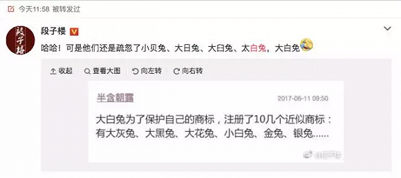 6月14号,有一条微博火了。有网友说:大白兔为了保护自己的商标,注册了十几个近似商标:大灰兔、大黑兔、大花兔、小白兔、金兔、银兔……