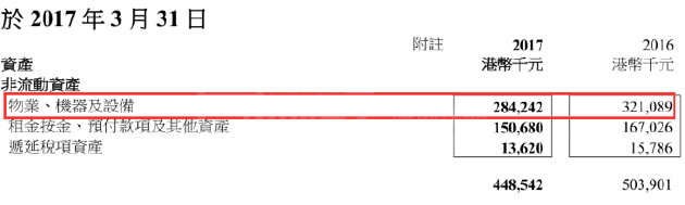 更值得关注的是莎莎的非流动资产极少,截至2017年3月底,其非流动资产仅为4.48亿,较上年同期减少10.99%。其非流动资产中,物业、机器及设备资产仅为2.84亿港元,占其净资产的比重仅为12.8%。这意味着其物业账面价值最高也不超过2.84亿港元,大部分店面都是租赁而来。租金按金看似资产,但只要其营业,这一笔支付无法避免。这也就是说,莎莎资产负债表中真正的“硬干货”并不多,一旦顾客远离莎莎而去,面临价值进一步蒸发的风险。下图为面包财经对莎莎财报的截图: