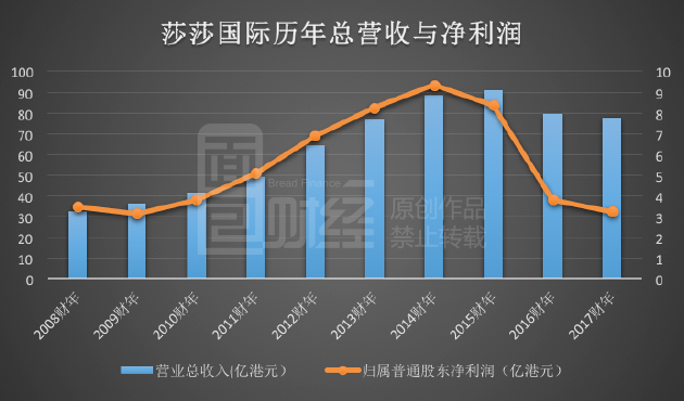 近日,莎莎国际发布的业绩公告显示,2017财年(2016年3月底—2017年3月底),营业收入为77.46亿港元,同比下降0.6%;净利润为3.26亿港元,同比下跌14.8%。莎莎营收已连续两年下滑,净利润与2014财年相比,跌幅高达65.14%。下图为面包财经根据财报绘制的莎莎国际总营收与净利润: