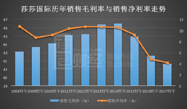 与此同时,莎莎的毛利率也在持续下滑,2017财年,其销售毛利率为41.5%,与上年相比减少了1.7个百分点。事实上,2017财年,其销售毛利率已是自2008财年以来的新低;该年,其销售净利率仅为4.16%;这也意味着莎莎降价促销的空间已极为有限。下图为面包财经根据财报绘制的莎莎销售毛利率与销售净利率走势: