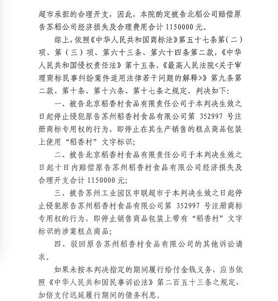 判决内容包括:被告北京稻香村食品责任有限责任公司于本判决生效之日起停止侵犯原告苏州稻香村食品有限公司第352997号注册商标专用权的行为,即停止在其生产销售的糕点商品包装上使用“稻香村”文字标识;北京稻香村食品责任有限公司于本判决生效之日起十日内赔偿原告苏州稻香村食品有限公司经济损失及合理开支合计115万元;被告苏州工业园区申联超市于本判决生效之日起停止侵犯原告苏州稻香村食品有限公司第352997号注册商标专用权的行为,即停止销售商品包装上带有“稻香村”文字标识的涉案糕点商品。