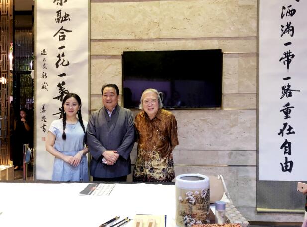 活动当天正值中国传统节日元宵佳节,名家书法艺术展精心遴选了中国多位知名艺术家的书法作品,作为新春献礼以飨宾客。著名艺术家姜昆、陕西书协秘书长王改民等书法名家,更在现场挥毫落纸,舞墨斗文,用对联抒发对推动中新两国文化交流的美好愿望,令现场中国年味十足。