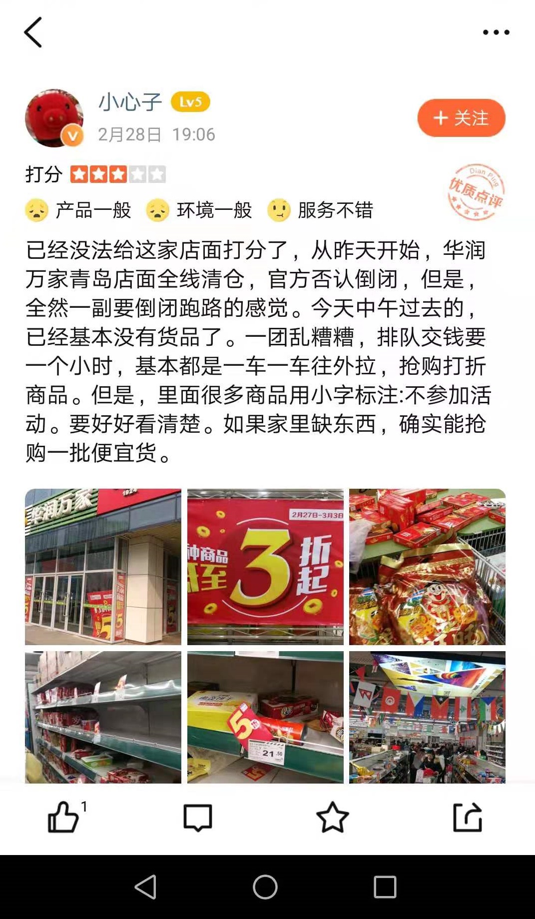 几乎同时,“华润万家超市要撤离青岛”的消息也广泛传播,其在青岛的乐客城、李村万达广场、东方城等多家门店也在进行打折促销。在大众点评上,很多网友反映华润万家超市的商品特别便宜,且多数货架已清空。