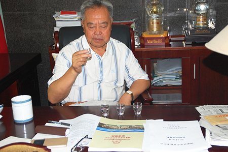 我们在徐老办公室采访进行中,二名技术人员带来4瓶酒4个酒杯来到徐老面前,熟练地摆放在徐老办公桌前,倒上瓶中白酒,徐老就这样一看二闻三品尝,没有交流开始品鉴酒的品质。我在现场感觉到酒在徐老的嘴里,是那么香甜,似可口的佳肴,在徐老的舌间不停的搅动。“可以,这批次要得”