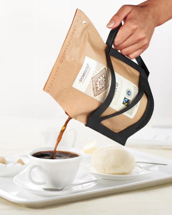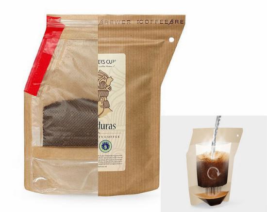 咖啡冲泡袋(Coffeebrewer)是Grower‘s Cup带来的一款包装与一次性咖啡壶的组合设计,设计时,设计师创新的将一次性咖啡过滤器与滤压壶的概念完美的融入了包装中。它内含26G顶级的咖啡粉,使用时将热水倒入包装后再把袋口封起来 ,整个包装就相当于一个烹煮咖啡用的滤压壶 ,静待五到八分钟,香醇美味的咖啡就可新鲜出炉了。