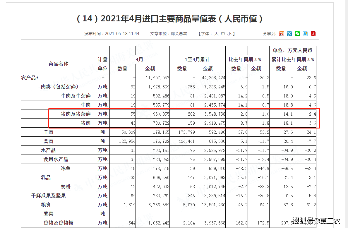 另外,据官方数据了解,4月份,我国猪肉进口43万吨,环比减少了6.5%,前四个月我国猪肉进口累计达到了159万吨!其中。4月份,猪肉进口43万吨,金额789722万元,其中,4月份猪肉进口折算均价大致18365元/吨,而3月份,猪肉进口均价折合为17905元/吨,可见,4月份,猪肉进口均价上涨了460元/吨!