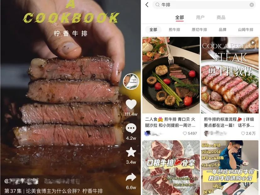 关于牛排的高热度视频大部分为煎牛排和选购攻略(图 抖音、小红书)