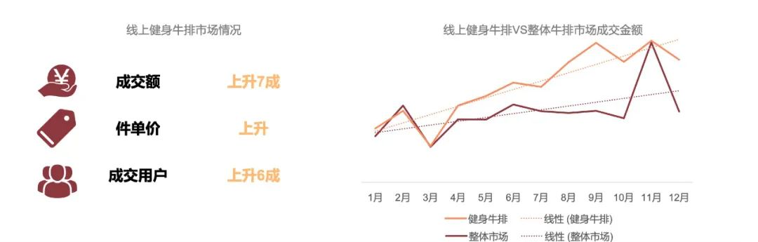 在健身牛排场景下,用户更偏好瘦肉含量高的原切牛排,草饲喂养的牛肉产品更符合其需求。据统计数据,当下健身群体的扩大让健身牛排实现了高增长:近一个月来,成交用户数比去年同期上升6成、总成交额上升7成。对比整体市场,健身牛排销量自2021年3月开始大幅上升,成交额大幅领先整体市场,即使在9月非大促时期也呈现阶段性上涨。