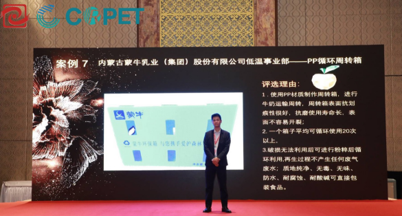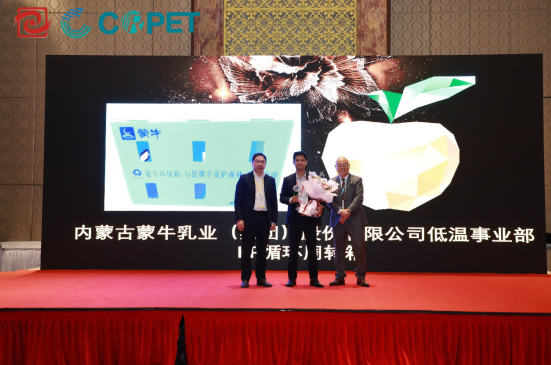 10月20日,在第二十三届中国塑料回收和再生大会上,中国合成树脂协会塑料循环利用分会(CPRRA)与中国塑料可持续发展协会(CSPA)授予蒙牛集团可回收性设计“金苹果奖”,以表彰蒙牛在全产业链推广实施塑料可回收性设计理念及标准,助力中国解决塑料污染的努力。