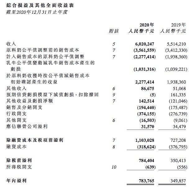 现代牧业在公告中披露的原料奶行情显示,原料奶2020年平均销售单价为4.13元╱公斤(2019年为4.04元╱公斤),同比增长2.2%。每头成乳牛年产量11.1吨(2019年为10.6吨),同比增长4.7%。2020年,得益于原料奶平均售价上涨及奶产量提升,毛利率(于原料奶公平值调整前)同比增长至40.8%(2019年为38.1%)。