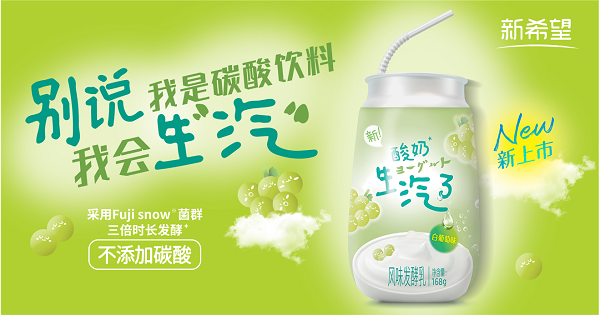 研发人员们基于海量的市场调研数据,决定最大限度保留酸奶本身的质感,并在这一前提下大胆尝试趣味性的顛覆与碰撞。在探索过程中,酸奶自然发酵产生的气泡引发了他们的灵感——这些气泡既有年轻人喜爱的碳酸饮料口感,又是乳酸菌天然发酵产生,健康清新,口感新奇,跨界有趣,正是年轻人所喜欢的特性。他们抓住这一次的灵感迸发,利用新希望乳业强大的科技创新力量投入产品研发。研发人员们筛选出一款稳定的气泡菌种Fuji snow,采用低温慢发酵技术有效激发乳酸菌的异型发酵,再通过胶体复配,让酸奶在发酵之后形成微型空腔,有效滞留了产品内部非稳态二氧化碳。通过反复配比实验,最终让气泡酸奶在保证口感清爽前提下,突出了绵密气泡的刺激体验,兼具美味和感官体验。