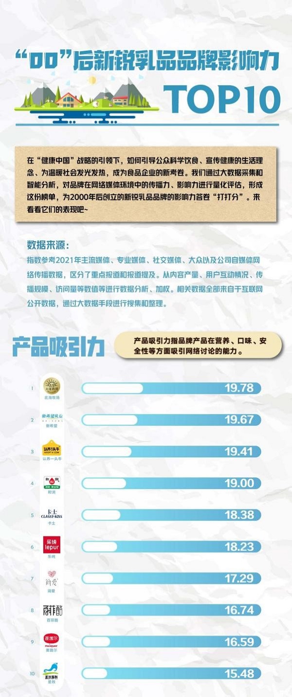这一次精准的创新,利用酸奶本身的特质和科技赋能,开创出一种全新品类。独特的气泡口感,Fuji snow菌种三倍时长发酵带来的全新气泡口感,打开一罐清新的包装,瞬间溢出满满的白葡萄香气,炎炎夏日饮上一口,沁凉透爽,让人无限沉浸在清新自然的世界中,仿佛心情也变成了浅绿色。配合线上“酸奶生汽了”的趣味话题营销,一经上市就俘获了Z世代的心,成为线上网红款,线下断货王,也开辟了酸奶市场的创新品类赛道。而新希望乳业也凭借着自身的产品创新能力,在近期由中国青年报·中青在线和北京中青华云新媒体科技有限公司联合发布的《“00”后新锐乳品品牌影响力TOP10》榜单取得了产品吸引力排名第二的优秀成绩。