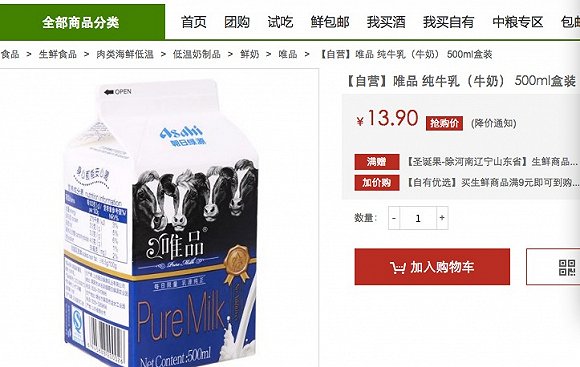 因为低产、天然的品质,2008年朝日绿源乳业推出其在中国液态奶市场的首个产品——“唯品”牛奶,仅限于北京、上海及青岛的中高级商超销售,售价为普通牛奶的2倍。截至发稿前,在中粮我买网上仍然可以检索到唯品牛奶,500毫升的盒装售价13.9元。