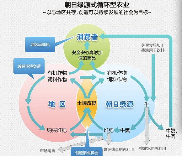 在成立之初,朝日绿源的目标利用牛粪的堆肥不依赖化学肥料等维持地力的“循环型农业”,在2008年成立了乳业公司之后,将奶牛养殖也加入了这个循环农业的链条,并在其官网给出了示意图。