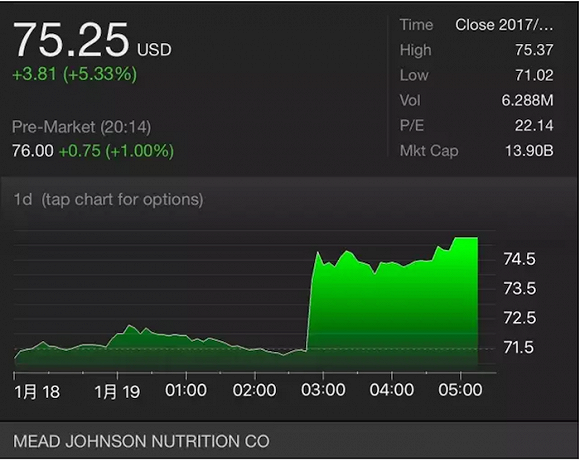报道称,雀巢的一位代表接受查询时表示不会评论市场传言,而美赞臣则未回复该网站的查询。不过,受到消息影响,美国当地时间昨日美赞臣的股价应声上涨了5%。