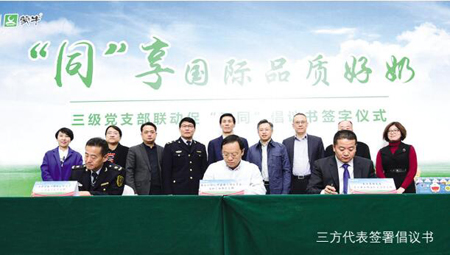 以“专注营养健康,每一天每一刻为更多人带来点滴幸福”为己任的蒙牛乳业集团与国家认监委、内蒙古自治区出入境检验检疫局联合主办的三级基层党支部联动促“三同”倡议书签字仪式日前在呼和浩特蒙牛和林六期工厂举行。倡议书提出,通过三级党组织的联动,帮扶蒙牛树立国际形象,增强国内消费者对乳品消费的信心。2015年,蒙牛率先响应国家质监总局及国家认监委启动的出口食品企业出口与内销产品同线同标同质工程(简称:三同)号召并开展了一系列相关工作。2016年,蒙牛凭借完善的质量安全管理体系、严格的质量操作规程、智能化的生产管理,其出口产品的加工基地(生产三厂,生产四厂),清远事业部、天津事业部先后通过了“三同”审核,成为全国首家通过“三同”认证的乳品企业。