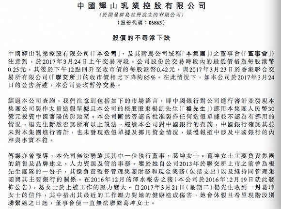 3月28日,辉山乳业再次发布公告,确认分管财务和现金业务的副总裁葛坤失联,并有多笔贷款还款逾期,但否认了此前关于大股东伪造单据及挪用资金投资地产的传闻。
