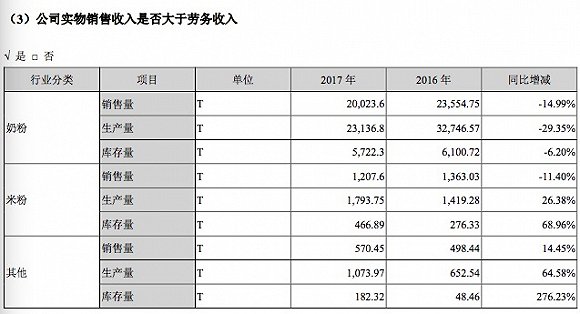 从贝因美给出的生产和销售的数据来看,占贝因美营收90%以上的奶粉产品在过去一年中,生产量、销售量、库存量都是下滑的状态,尤其是生产量减少了29%。这意味着贝因美的产能没有满负荷运转,进而造成成本间接提升。