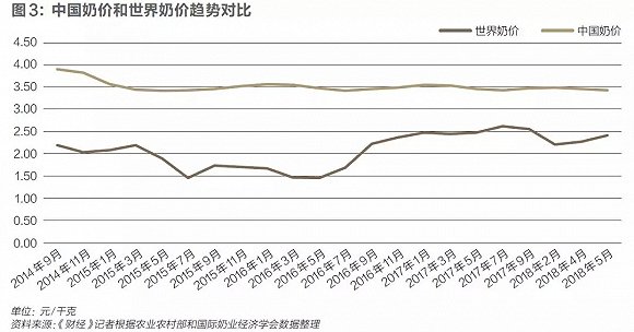 农业农村部和国际奶业经济学会数据显示,2014年9月以来直至近几个月,中国奶价跌势明显,而国际奶价在波动中升高,“(中国)奶价波动完全被压在一条水平带上。”王玉庭表示。