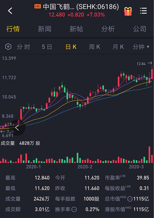 尽管全球股市集体爆冷,上演史诗级大跌,但3月10日开盘,中国飞鹤(06186 HK)逆势领涨,盘中大涨7个点,市值升至1115亿港元,自此,中国飞鹤跃升为港股乳制品行业市值第一的企业。此前一天,3月9日,中国飞鹤正式纳入港股通。当日,中国飞鹤盘面最高12.24,最终报收于11.66,市值1042亿港元,相较于上市之初的670亿港元涨幅高达55.52%。