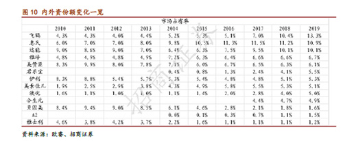 时下,以中国飞鹤外代表的国产乳企“翻身战”已经打响,凭借“更适合中国宝宝体质”进行的产品创新,中国飞鹤年销售量已突破一亿罐,成为中国婴幼儿首选奶。招商证券出具的调研报告显示,2019年中国飞鹤以13.3%的市场占有率,坐稳行业第一把交椅。