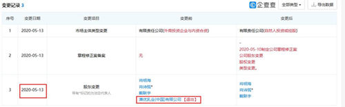 企查查资料显示, 5月13日,澳优乳业(中国)有限公司退出了美优高乳业(湖南)有限公司,同时美优高乳业的市场主体类型也从有限责任公司(外商投资企业与内资合资)变为了有限责任公司(自然人投资或控股)。