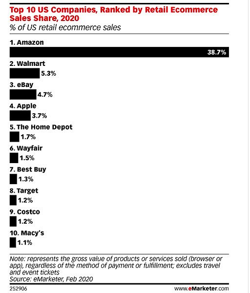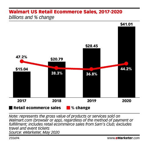 市场研究公司eMarketer今年5月份的报告预计,2020年沃尔玛美国电子商务销售额将增长44.2%,达到410.1亿美元,比2019年增长36.8%,也比eMarketer 2020年1月的预测(27.0%)更高。目前,沃尔玛电商业务的市场份额排名第二,但相较亚马逊差距较大。