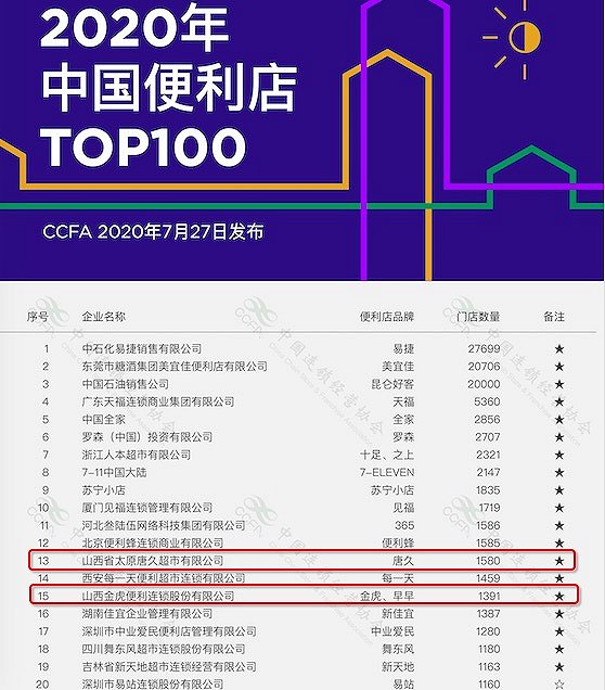 它们当中,前者是太原最大的连锁便利店企业,后者与之规模相当,也是其最主要的竞争对手。在中国连锁经营协会7月27日发布的《2020中国便利店top100》名单中,唐久便利和金虎便利分别位列第13、15名,各自旗下拥有的门店数量为1580家和1391家。