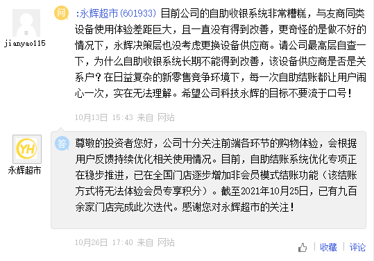 快消品网注意到,10月26日,永辉超市在互动平台上回复投资者“公司的自助收银系统非常糟糕,与友商同类设备使用体验差距巨大,且一直没有得到改善”的提问时表示:“公司十分关注前端各环节的购物体验,会根据用户反馈持续优化相关使用情况。”