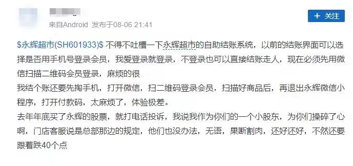 “去年年底买了永辉的股票,就打电话投诉,我说我作为你们的一个小股东,为你们操碎了心啊,门店客服说是总部那边的规定,他们也没办法,无语,果断割肉,还好还好,不然还要跟着跌40个点。”抱怨线下自助结账系统的同时,消费者进而质疑对永辉超市股票进行投资的决策是否正确。