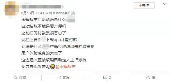 快消品发现,陈女士遇到的问题并非个例,在社交平台上长期有不少消费者“吐槽”永辉超市自助结账系统不好用。有消费者在社交平台上发表质疑称:“自助结账不就是要方便吗,之前扫码付款就很恶心了,现在还要下载app才能付款。到底是什么产品经理想出来的政策,用户体验感真的太差了,这边建议直接取消自助走人工结账呢。”