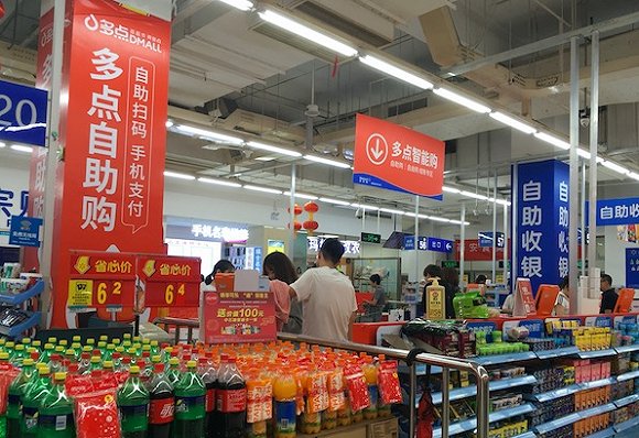 9月12日,界面新闻走访沃尔玛北京宣武门店时发现,沃尔玛自助收银区域的一大半面积,留给了新兴零售科技公司多点。这里布置了多点智能购的自助收银机器,并有穿着橙色工作服的多点员工不断在人工收银区宣传多点,鼓励消费者去自助收银区结算,并试图说服一些使用多点智能购的消费者下次使用多点APP或者小程序下单享受到家服务。