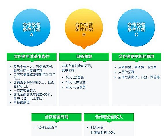 此外的两种加盟方式是扶持加盟和合作加盟,前者针对已有店铺加盟者,后者无需挂牌只需要从好邻居采购一定金额(1000元)的货品。