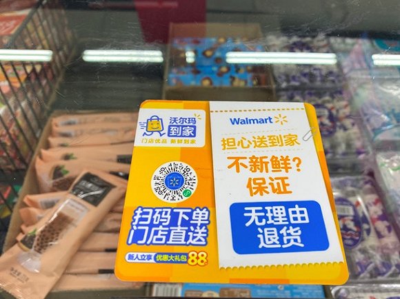 界面新闻走访沃尔玛北京宣武门、建国路店发现,卖场员工积极推广沃尔玛到家小程序,一名员工会去收银台排队的顾客中宣传沃尔玛到家,以优惠券、送到家、赠品等方式吸引了不少改为小程序下单的顾客。