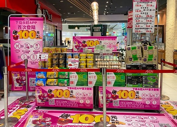 今年4月8日开始上线的永旺APP也在其卖场进行类似的玩法,货架、收银台、出入口随处可见的京东到家绿色系宣传物料被替换成了永旺APP的下载提示。