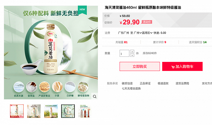 在即简裸酱油上市不久前,海天味业还曾推出过同样走高端定位的“清简酱油”,零售价为29.9元/瓶,同样强调简单配方,共6种配料,以“还原食材本真的味道”。