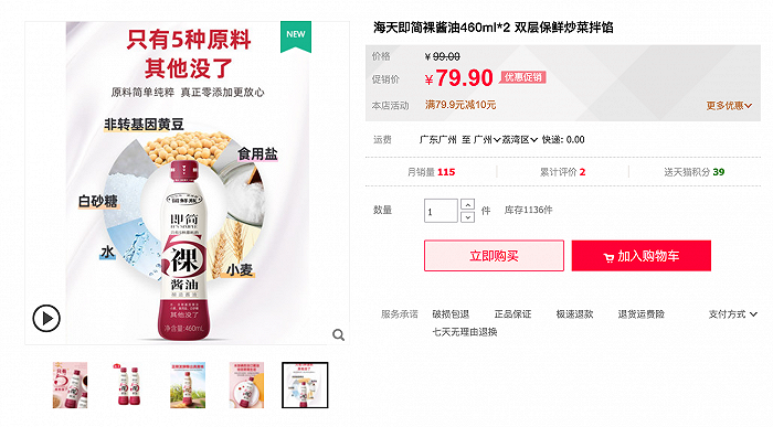 海天味业近日推出了一款高端酱油这款单价接近40元(460ml/瓶)的新品,名为“即简裸酱油”。据海天天猫旗舰店介绍称,该产品为特级酿造酱油,品质高出国家“酱油特级”标准线,氨基酸态氮含量≥1.0g/100ml。