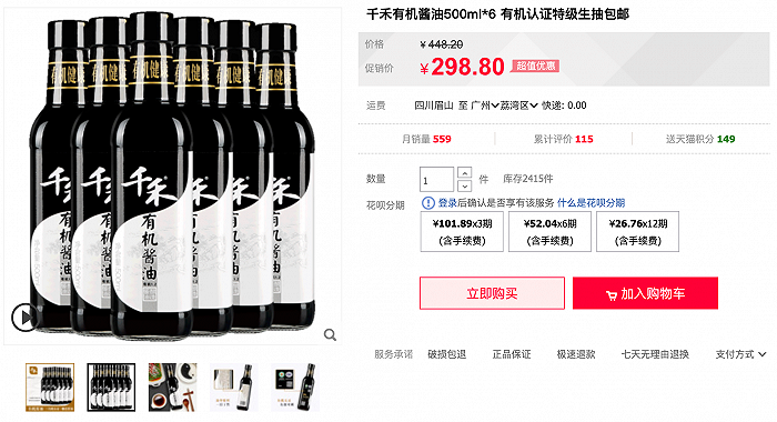 以千禾味业为例,食品快消品网了解到这家公司成立于1996年,最早以焦糖色等食品添加剂业务起家,在酱油领域属于半路出家。为了抢占中高端市场,形成差异化竞争优势,千禾味业的产品定位侧重于中高端,酱油一直主打零添加和有机的概念。在市场终端定价上,排除折扣优惠等因素,一瓶500ml的千禾酱油价格区间在19.8元/瓶-49.8元/瓶。