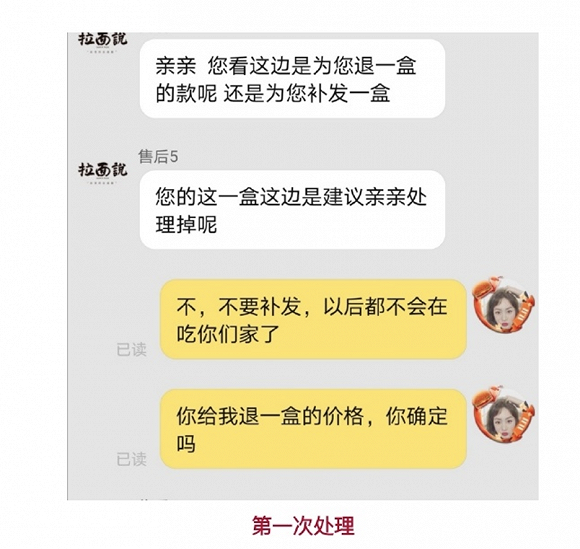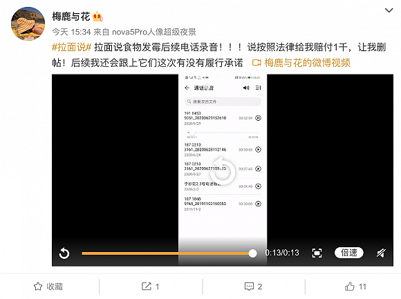 “梅鹿与花”发微博称,品牌已经与她电话沟通,愿意赔付1000元。其发布的一段录音中,“梅鹿与花”表示如果品牌方赔付1000元,她将撤回投诉,并删帖。拉面说方面表示,已按照消费者要求赔付了1000元。但对方尚未删帖并提出了更高的赔付要求,双方还在继续协商中。