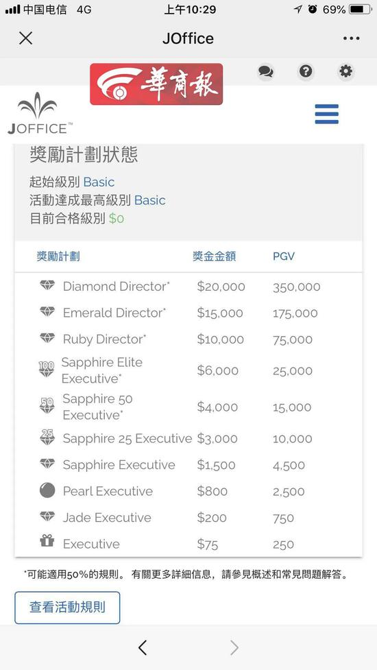 8月18日,记者看到婕斯的广告宣传页上称,一包婕斯白藜芦醇果汁含量等于168瓶红酒的含量,并有抗衰老等功能,婕斯会员登录网站上显示,奖励计划中分了10个等级,奖励金额从75美金到20000美金不等。而小杨父母平时食用的婕斯产品外包装上,并无任何中文字样。